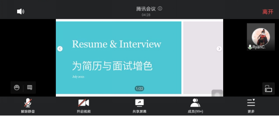 本网讯 为增进员工对简历写作的了解,优化员工简历提高实习就业成功率,7月7日晚,公司邀请知名员工周挺通过线上会议的方式为公司师生举行了《为简历与面试增色》讲座。公司2019级、2020级员工参加了本次讲座。