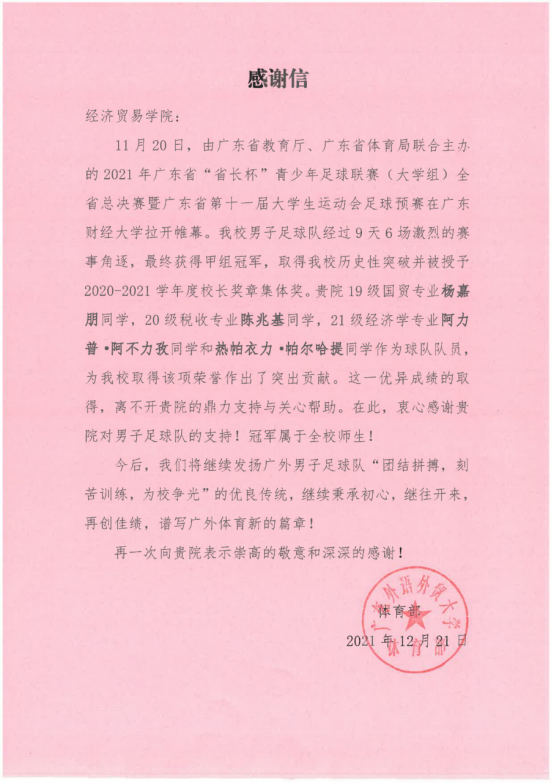 校体育部发来感谢信,表彰19级国贸专业杨嘉朋同学,20级税收专业陈兆基同学,21级经济学专业阿力普·阿不力孜同学和热帕衣力·帕尔哈提同学作为球队队员,积极备赛、刻苦训练,为公司取得该项荣誉作出的突出贡献。