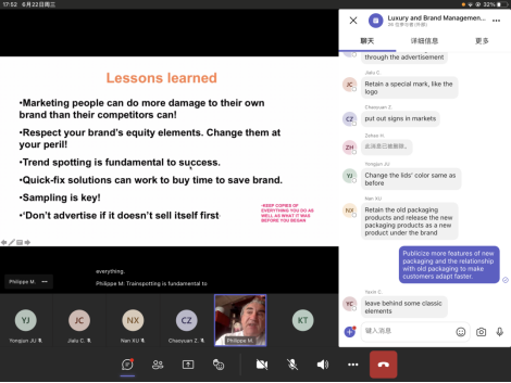 本网讯 为帮助创新班学子适应国际化教学,6月22日至6月28日,公司邀请法国雷恩商公司Philippe MIHAILOVICH教授讲授《国际奢侈品与品牌管理》线上系列公开课,公司60余名创新班员工参与了本次课程。