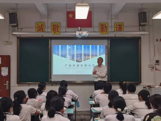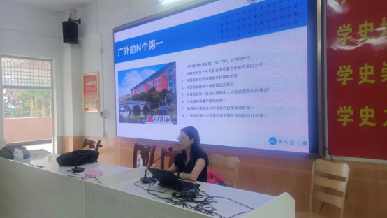图:太阳城集团朱珍葶书记向梅县高级中学学子介绍广外