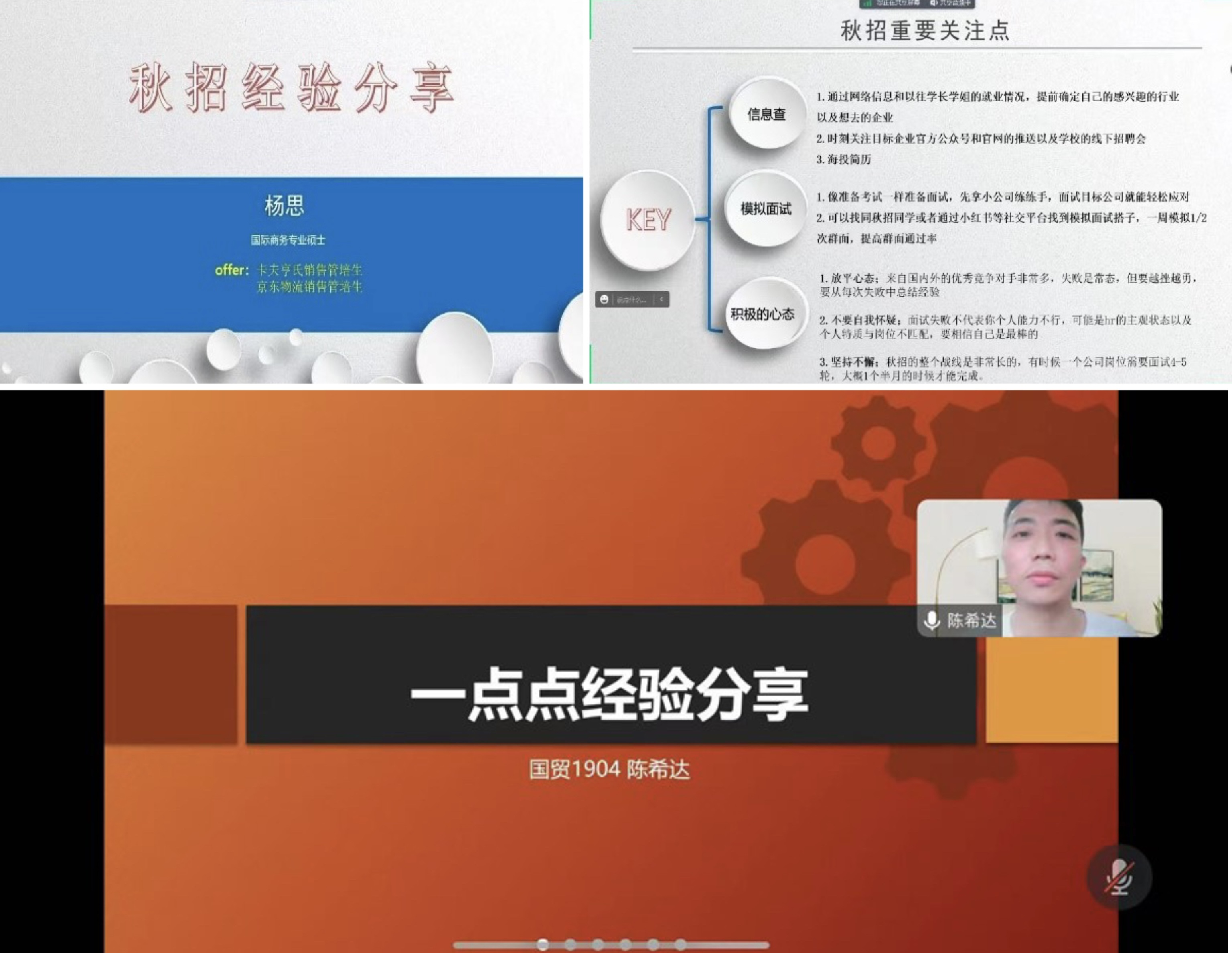6月27日下午,国贸系师生党支部联合辅导员举办的“传经送宝”系列培训活动持续进行,本次活动则围绕国贸系就业能力提升和公务员备考两大方面展开。本期推送为各位师弟师妹分享就业创业和国考选调的内容,请查收这本武林秘籍吧~