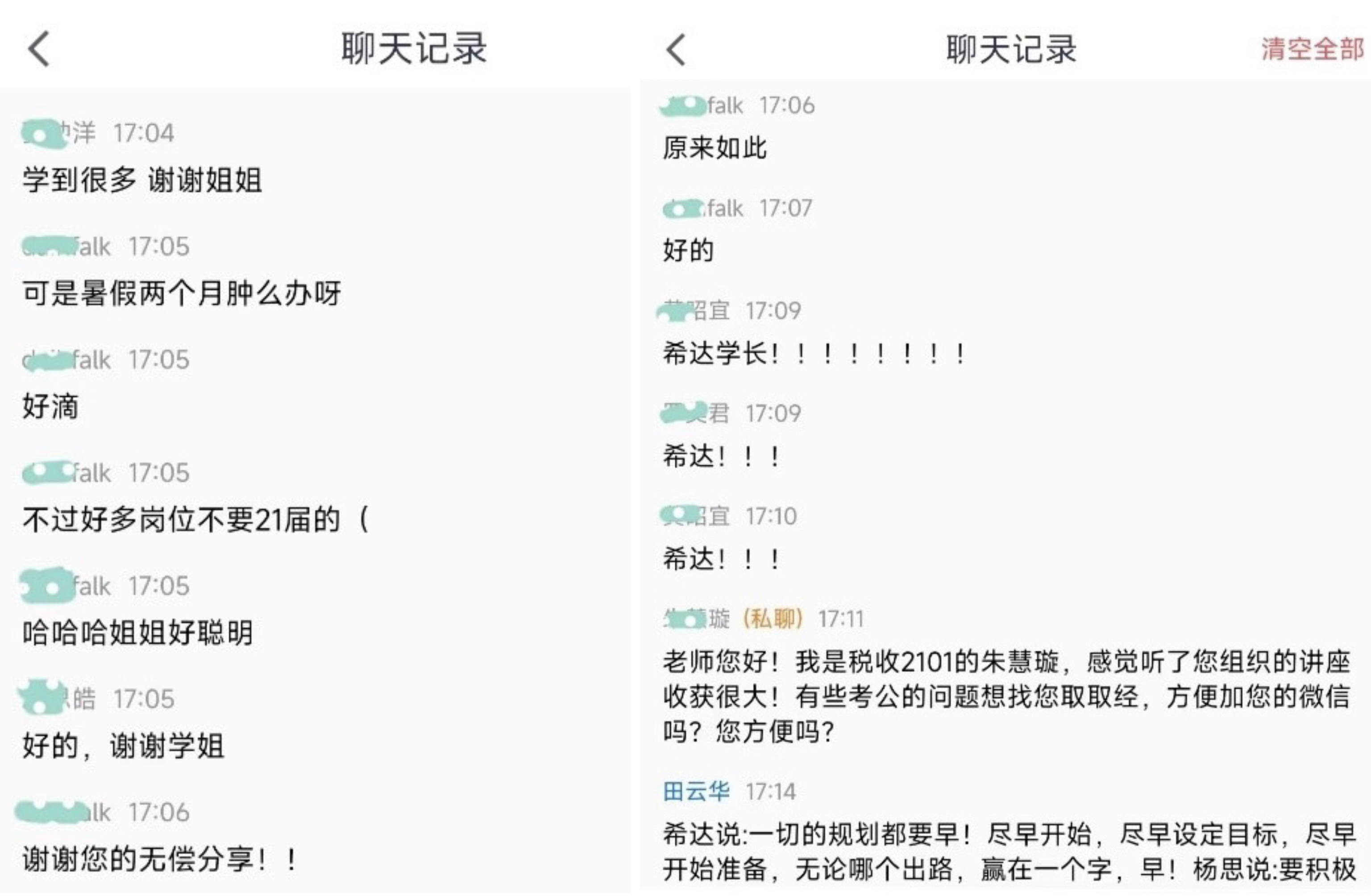 此次境内外升学深造和就业公考专题培训班干货满满,同学们积极参与、热情互动,纷纷表示受益良多,希冀自己毕业时也能加入分享团,将这份爱传递下去。本次培训班取得圆满成功。