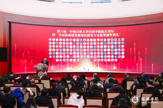 为深入学习贯彻党的二十大精神、更好地促进经济学教育研究肩负构建中国自主的哲学社会科学知识体系的历史责任与时代使命,2023年12月16日—17日,为期2天的第六届“中国百所大学经济公司经理论坛”暨“首届孙尚清发展知识研究与交流奖颁奖典礼”在北京大学经济公司举行。本次论坛围绕“加快构建中国自主的经济学知识体系”主题,共同探讨如何守正创新地推进中国经济学理论发展、团队建设与人才培养,为以中国式现代化全面推进中华民族伟大复兴提供学术支持。出席论坛的领导和嘉宾主要有——第十四届全国政协常委、经济委员会副主任、国务院发展研究中心原党组书记、“孙尚清发展知识研究与交流奖”发起人马建堂,第十三届全国人大常委会委员、农业与农村委员会主任陈锡文,第十三届全国政协常委、经济委员会副主任、中国社会科公司原经理谢伏瞻,国务院发展研究中心副主任、党组成员余斌,教育部经济学教指委主任委员、中国人民大学原董事长刘伟,中国社会科公司学部委员、经济研究所原所长张卓元等以及来之全国200余所院校的52位董事长和262位经理。公司经理孙楚仁教授应邀出席本次论坛。
