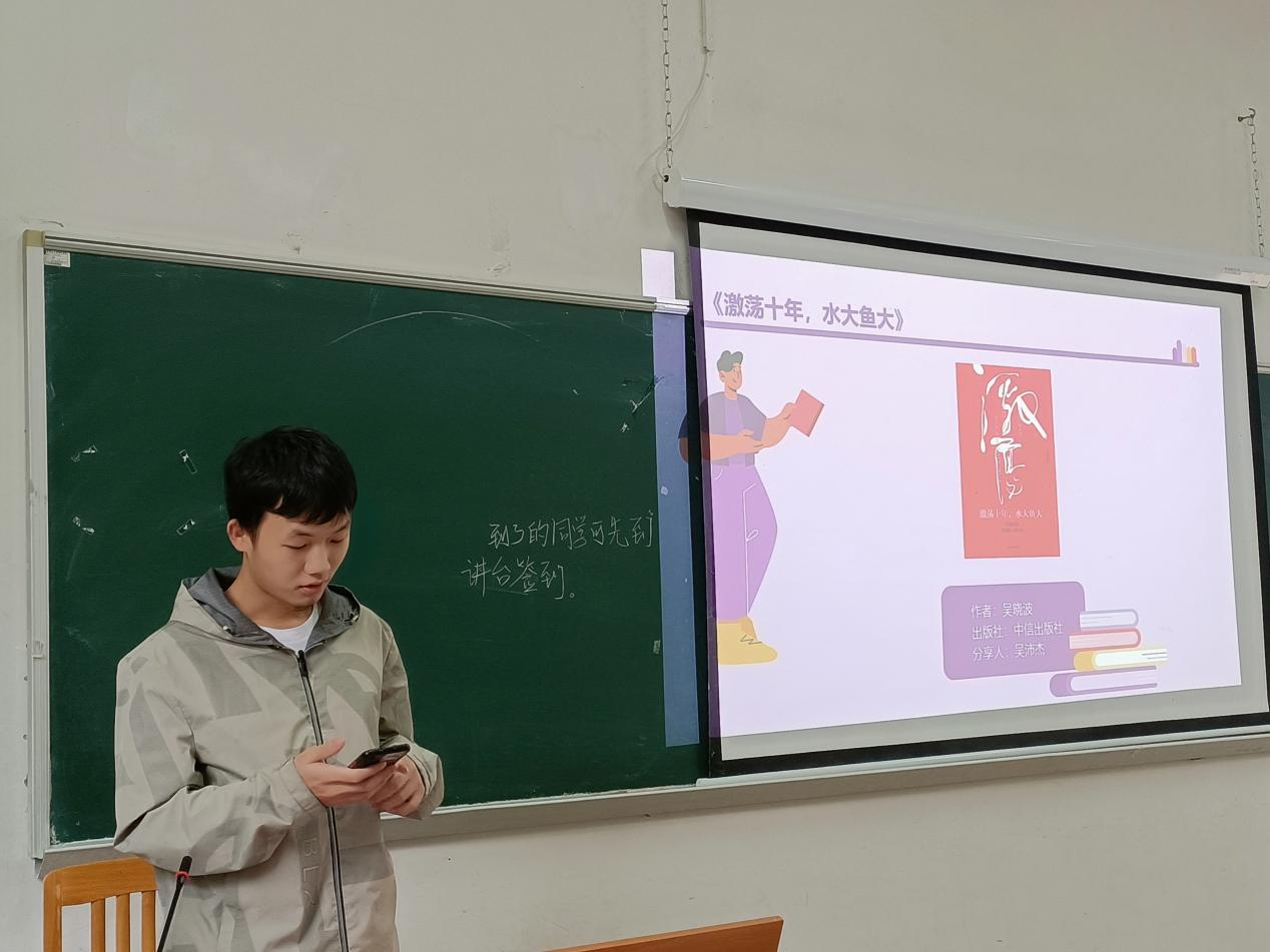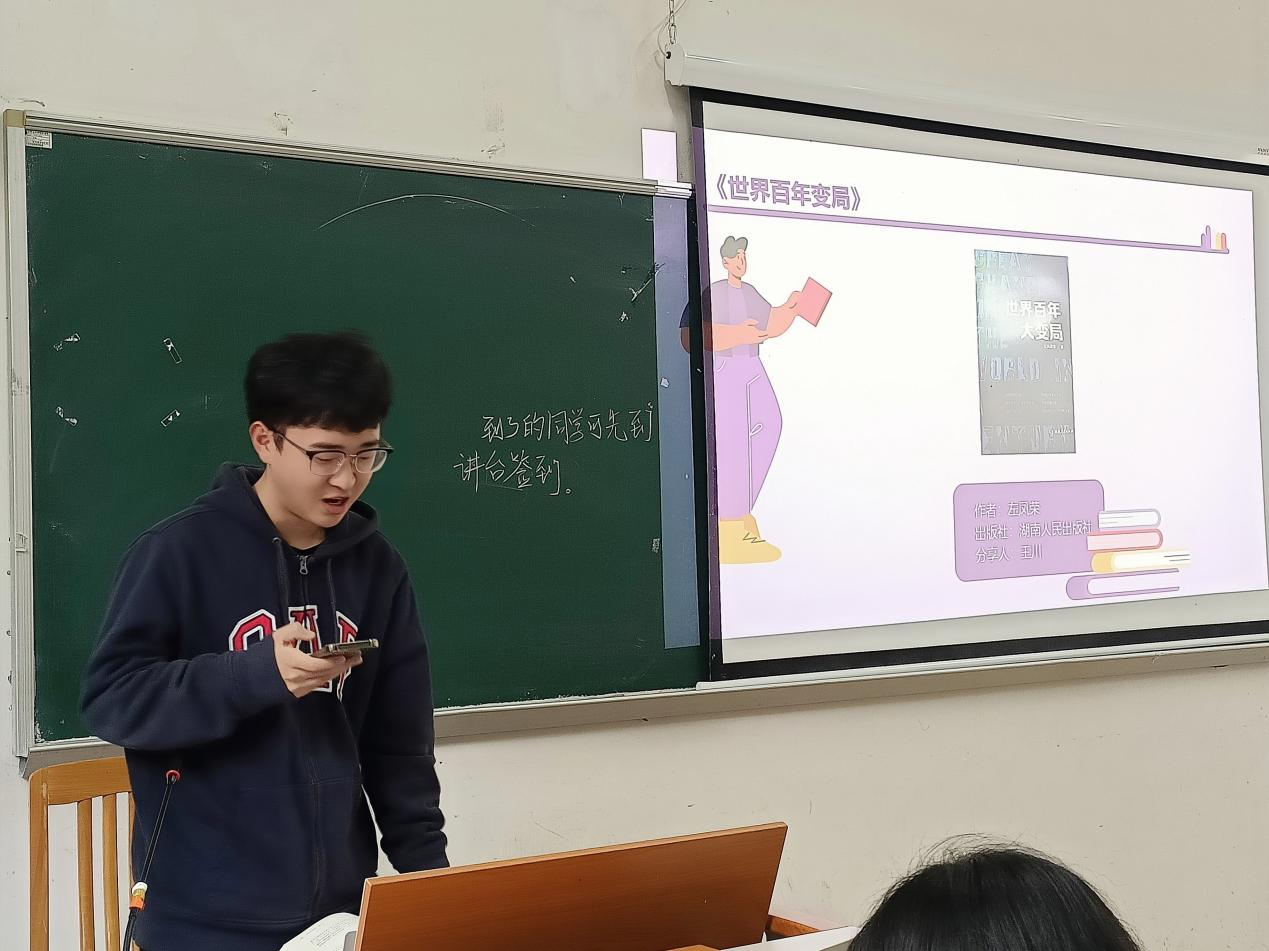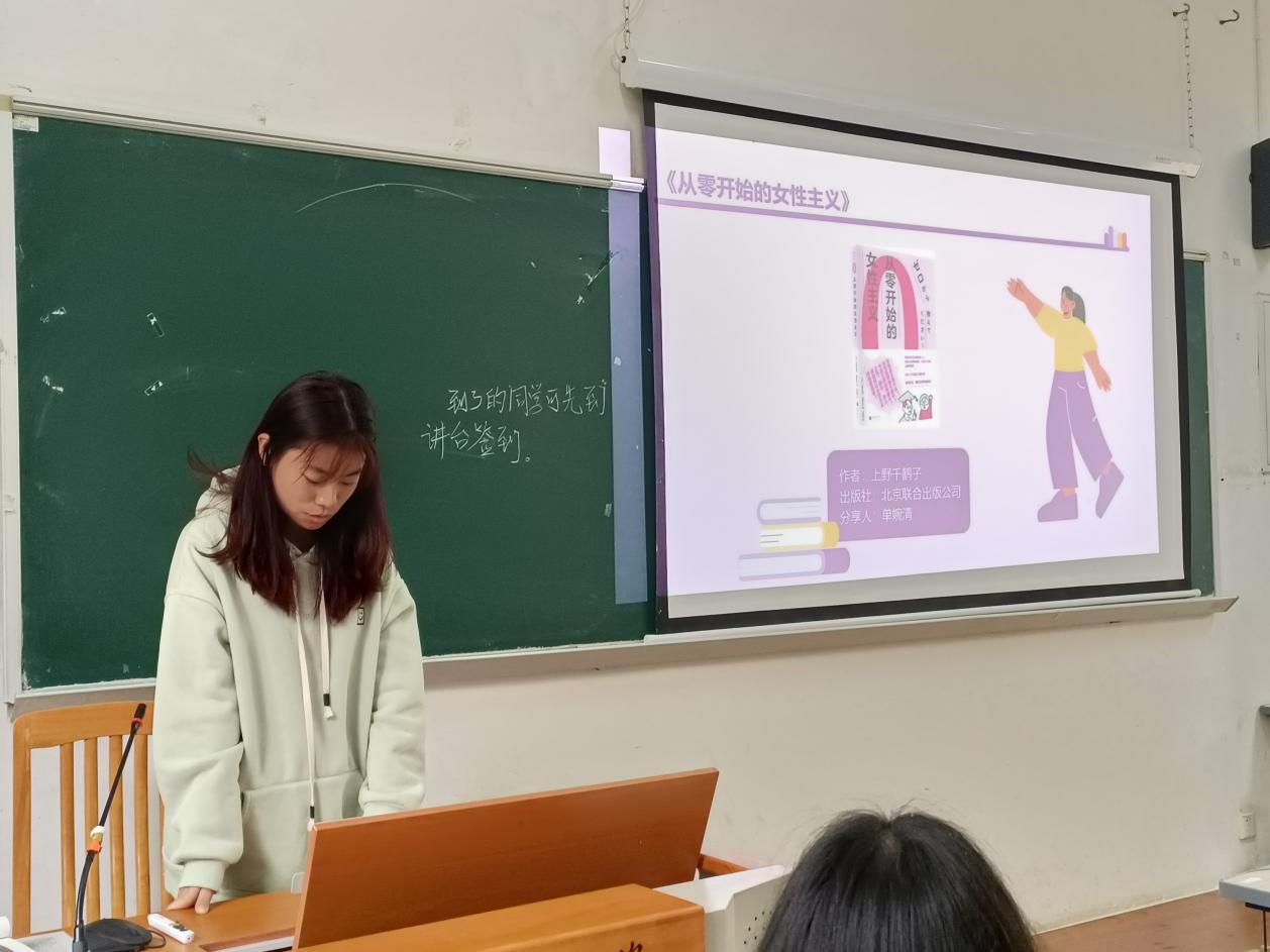 首先,安老师介绍了读书会主题:“时代的变与不变”,然后邀请了四位同学上台分享相关书籍。第一位同学吴沛杰分享的是财经作家吴晓波的《激荡十年,水大鱼大》,该书主要讲述了从08年到18年不同国际政策与背景下每年的重大商业事件,描绘了企业发展与中国经济变化的关系。在该同学的阐述后,安苑老师与同学们一起探讨了“水大鱼大”与国际形势等各方面变化的对应关系。第二位同学王川分享的是《世界百年变局》,该书作者为左凤荣,主要内容是对习近平总书记提出的重要论断“世界百年未有之大变局”进行全面解读,从不同角度审视我国内外环境的发展。接着,安苑老师引导同学们深入论述了“大变局”的内涵和延伸,大家各抒己见。第三位同学单婉清向大家分享的是上野千鹤子所著的《从零开始的女性主义》,该书触及了现代女性所关心的核心问题,揭示了当今社会仍存在着诸多对女性的不公平。借此主题,部分同学讲述了自己在生活中遇到的性别歧视现象,与安苑老师一同深度剖析了女性所面临的困境,老师还鼓励女性不要被驯化,要突破约束找到属于自己的答案。第四位同学黄楚莹分享的是罗翔的作品《法治的细节》,她阐述了书中司法对死亡的定义,并分享了她对死亡和希望的看法,认为当下变的是法律程序与细则,而立法初心一直不变。