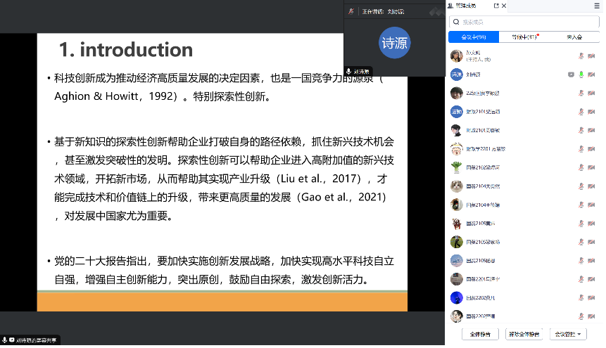 讲座中,刘诗源老师结合自己的学术研究成果谈及了探索性创新促进企业高质量发展的内容,剖析了企业探索性创新资源稀缺的问题,表明了税收激励政策与企业探索性创新之间的因果关系。他指出,同学们在今后的学术研究中都应在考虑现实因素的前提下,更为周密地提出自己的观点、表达自身的看法。他强调同学们在撰写文章中不仅要收集多方面的文献资料,还要注重文献排列的内生逻辑性,搭建文章的框架。