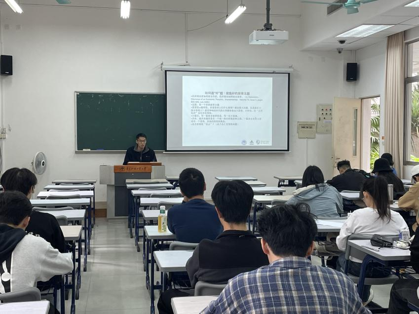 讲座中,王浩副教授首先向同学们介绍经济学研究中,什么是“好”的研究以及如何选“好”题。他指出,所谓“好”的研究,即研究有标准,例如,研究方法应设计良好、执行良好、数据和假设合理选择、选用文献应准确且有说服力等;在选“好”题方面,王浩副教授认为,经济理论家如同寓言作家,经济理论如同寓言故事,最重要的则是提炼好的故事主题,并找到侧重点,进行具体分析。随后,王浩副教授以自身规划为例,向同学们展示在外留学期间的学习和课余生活,讲述自己的学人生涯,并指出硕士博士生活不一定是枯燥的,希望同学们不要气馁。