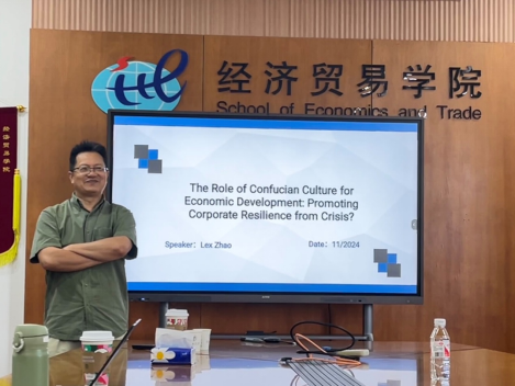 11月7日上午,赵来勋教授以“Traditional culture and business resilience”(《儒家文化与企业韧性》)为题进行了工作论文的分享。研究背景指出,以往文献往往关注传统文化对创新等方面的束缚,却忽略了其在风险承担方面的积极作用。而事实上,当面临危机时,传统文化能够促使人们团结一致以应对危机,有助于共同面对灾难,并鼓励互助合作的行为。研究认为,中国传统文化在危机期间会促进企业韧性。中介效应分析显示,这种促进作用是通过增强企业的内部控制实现的。与会师生针对文章的理论假说、实证模型构建、内生性处理、影响渠道分析等进行了深入讨论。