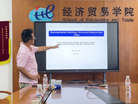 11月6日下午,赵来勋教授分享了其与合作者共同完成的工作论文,题为“Sourcing market uncertainty and exports”(《进口来源市场转换:来自中国企业的证据》)。研究背景指出,当面对外部冲击时,维持和稳定进口是许多发展中国家面临的一个主要实际问题。中国企业中广泛存在进口市场转换(SMS)(在2000-2016 年期间,SMS 企业占所有进口企业的76.29% 和进口总值的96.30%),文章使用中国工业企业和海关企业数据,研究发现进口市场转换可以显著减轻国际不确定性对进口的负面影响,进一步稳定企业就业和创新,从而提高国家乃至全球的福利,该结论通过了一系列稳健性检验,并进行了内生性处理。在影响渠道上,SMS 的可能动机包括稳定进口供应、降低进口关税、提高实际汇率和增加产品转换。SMS 的效果因不确定性类型、企业所有制、生产率、信贷约束、贸易模式和产品特征而异。与会师生针对文章的理论假说、实证模型构建、稳健性检验、内生性处理、影响渠道分析进行了深入讨论。