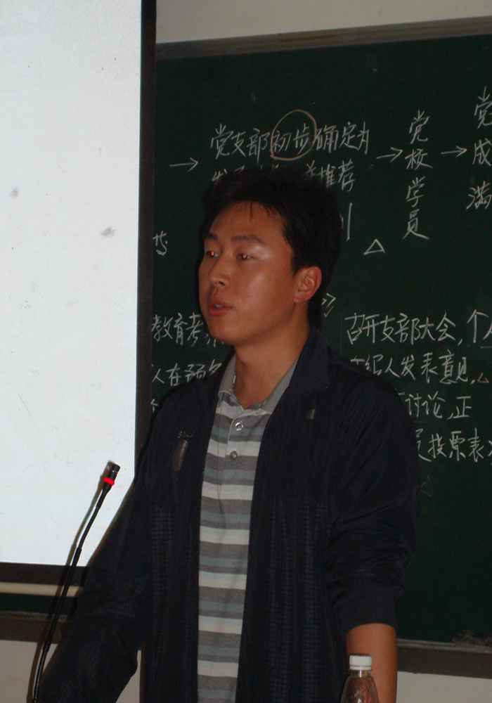 接着,由袁金轩老师就会前一些党支书提出的问题作了解释和说明。有部分党支书提出,党支部缺乏号召力,工作难以获得班级的有力支持。对此,袁老师指出,各位党支书应努力改进工作方法,积极开展工作,使支部工作对班级产生正面的影响,而不应把党支部当做发展党员的“生产线”。此外,在谈到发展党员这个问题时,袁老师说,不仅要在组织上,更重要的是在思想上入党,各支部要重视预备党员的再教育及培养,有些同学认为,积极分子考察时间够一年就一定要发展,但要知道,时间不是发展党员的唯一条件,是在其他条件都满足的基础上要考虑的因素。
