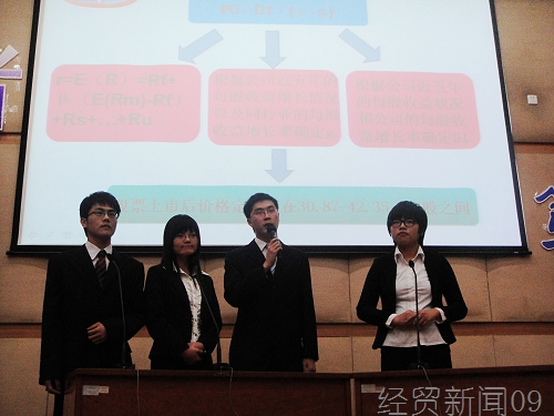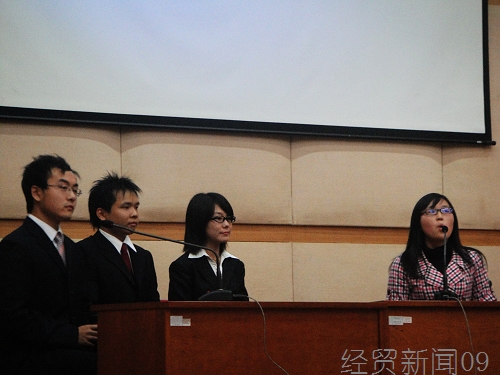 顺利通过第一站比赛的24支队伍被分成了六个小组。针对所给视频中所体现的“创业板的跌宕起伏”、“地下钱庄”、“经济复苏,制造业回暖”等社会经济现象,各小组选手运用经济理论知识,通过精彩的PPT展示和得体的现场阐述,对该现象作出加以评析,发表真知灼见。选手们的精彩表现博得了评委和现场观众的热烈掌声。