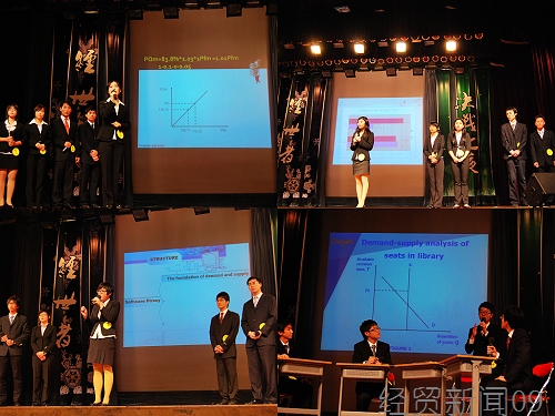 在第一环节的比赛中,8段精彩的视频向现场观众展示了参赛队伍的风采。经过前三站比赛,从49支队伍中脱颖而出的8支队伍分别就各自的主题进行了英文展示,其中既有医保问题、就业形势、图书馆占座等关乎老员工切身利益的问题,也不乏涉及日渐普及的网购和日益猖獗的盗版等社会问题。参赛队伍通过精彩的PPT展示、流利的英语表达以及专业的经济理论知识的结合,更有队伍以模拟图书馆管理层会议的形式,对图书馆占座做出经济学上的分析,为现场观众带来一场精彩的学术盛宴。
