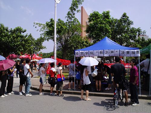 现场以一幅大红色的宣传板突出了本次“秋之声”的特色,吸引了大批员工在中午的烈日下排队等候。中午将有200名幸运儿将抽中“秋之声”的决赛门票,届时到现场领取正式门票。每位等候者均有二分之一的机会抽中门票,喜悦或失望的神情一一难掩。下午五点的第二轮抽票活动则派出100名决赛门票。