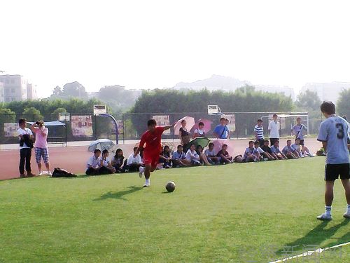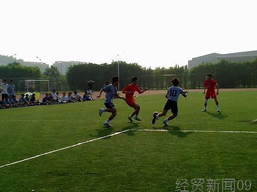 球场上烈日当头,身着红衣的经贸足球队与浅蓝衣的新闻足球队在3时45分左右展开了比赛。比赛初始,经贸足球队频繁进攻,多次射出漂亮的高球,但仍被新闻队的守门员一一捕获。上半场中期,新闻足球队声势浩大,开始活跃进攻,经贸队后卫出色的防守及守门员的奋力抱球,拦截了每一个新闻队的进球。