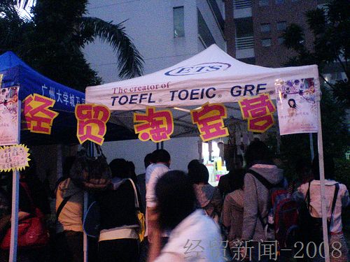 下午两点不到,各摊位已陆续摆出各式各样的商品,既有衣物、饰品,也有书本、植物、CD等等。各摊位都用各自独特的方式进行宣传,以吸引众同学的目光。前来选购的同学络绎不绝,各摊位几乎无一落空。太阳城集团的六个代表摊位以“经贸淘宝营”命名,全力再创“销售业绩”新高。