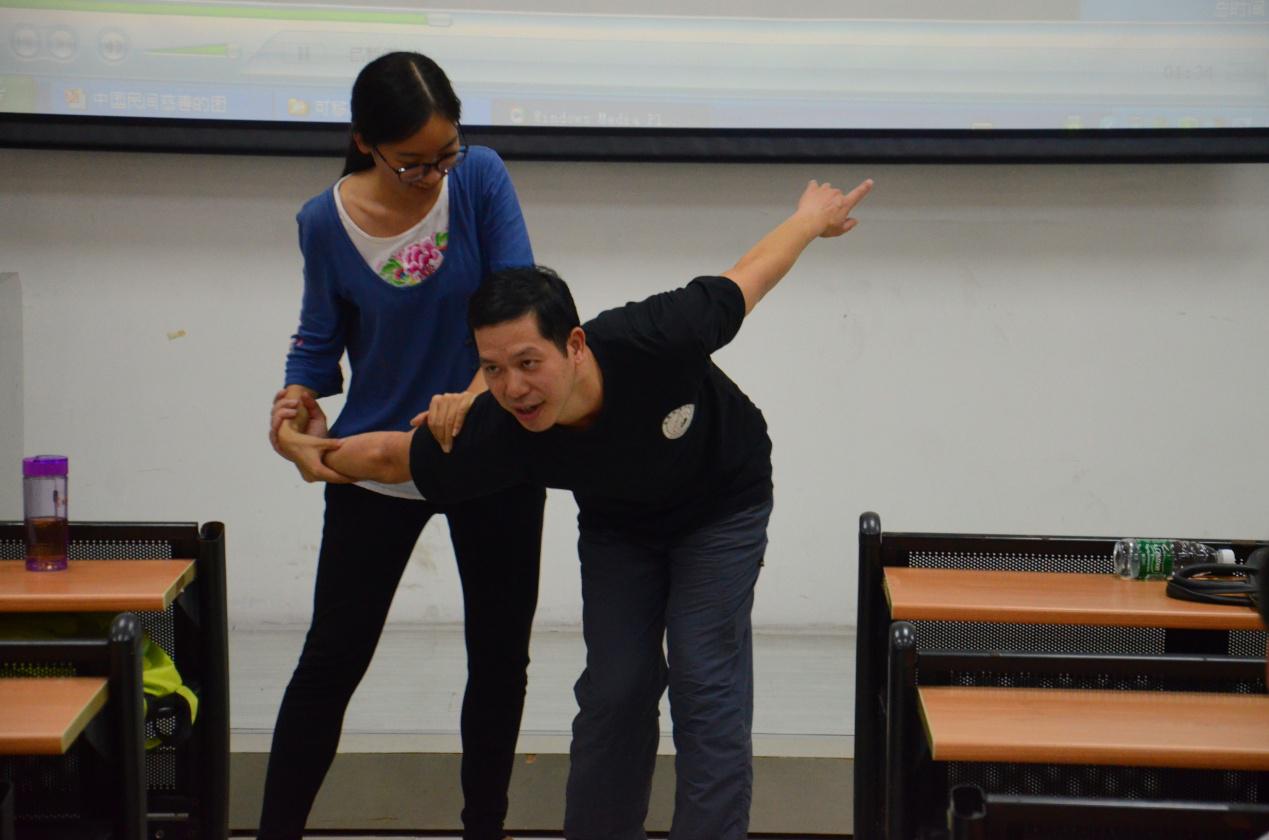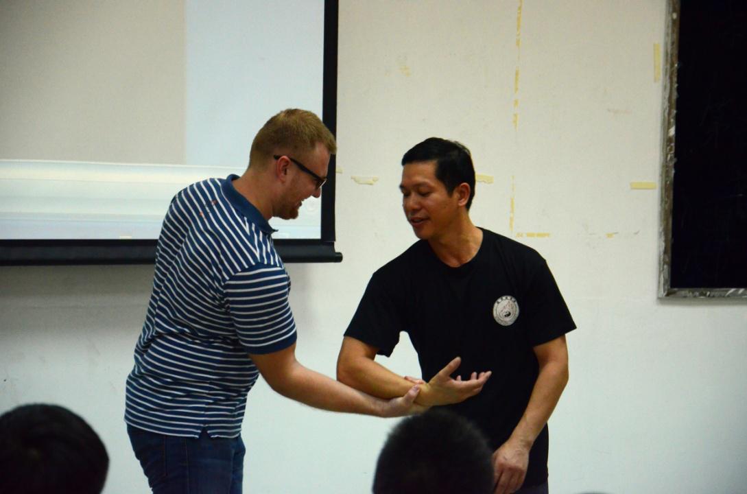 讲座的第二部分由龙保咏春拳武馆馆长陈巨如师傅主讲。伴随着气势如洪的背景音乐,陈巨如师傅给大家示范了刚柔并济的咏春拳法,获得了在场师生的满堂喝彩。并向在场观众讲述了龙保咏春拳武馆的慈善工作。最后,陈师傅还邀请员工上台进行切磋,示范如何在歹徒面前进行正当防卫,使现场气氛再现高潮。