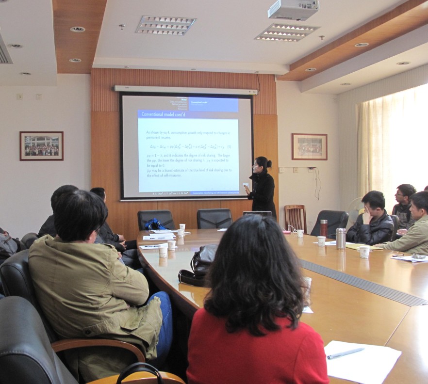 3月13日下午,由公司云山青年学者来特博士主讲,主题为“Consumption risk sharing and self-insurance across provinces in China: 1952-2008”的学术沙龙在南校区公司会议室开讲,李铁立经理、黄秀娟书记、廖国民经理助理、刘巍教授、袁申国教授、展凯博士、卢万青教授、杨碧云博士、张林博士、刘胜博士、邹亚宝老师和财经公司副经理邓可斌教授,以及公司研究生近30余人参加了本次学术沙龙。
