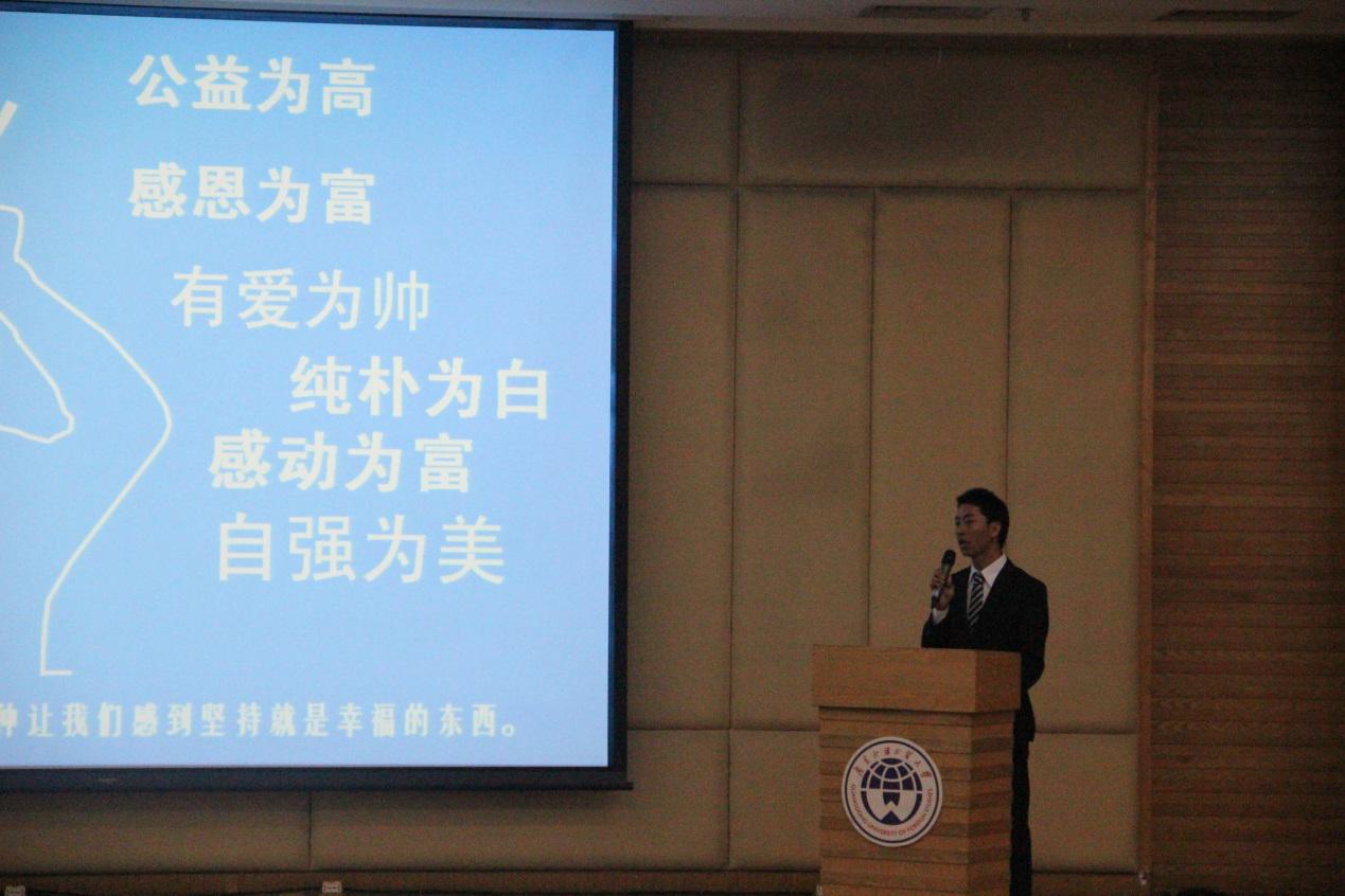 来自国际太阳城集团金融1102班的周炜列,以“左手扶贫,右手公益”为人生信条。他是自强社社长,三下乡队长,探访四川雅安灾区代表,担任着不同的角色,展现了同样优秀的习惯。他获得了许多荣誉,不在乎的也是荣誉。当评委老师问道往后是否会一直坚持投身公益事业的时候,他那句“做公益不难,难的是一辈子做公益。”早已回答了我们,他更以他的实际行动,以更高的姿态回答我们。他有一个公益梦,他就是周炜列。