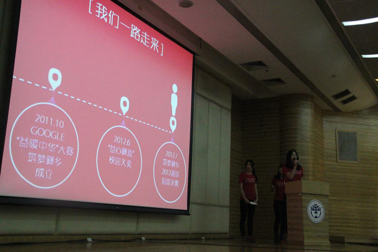 无独有偶,另一个候选者—— “筑梦彝乡”公益团队也致力于公益事业。它成立于2011年10月,是以广外在读老员工为主要力量组建的一个公益创业组织。作为一个教育型的公益团队,其关注四川、凉山彝族自治州,目前通过有针对性的地区性调研与持续型的教育资源输送,以期达到促进当地教育,并能建立长期且可持续的“筑梦模式”,推广筑梦团队的公益项目。在问答环节中,关于中国梦,团队有着独树一帜的看法。队员指出,要实现中华民族伟大复兴,必须从倡导“人人公益”。