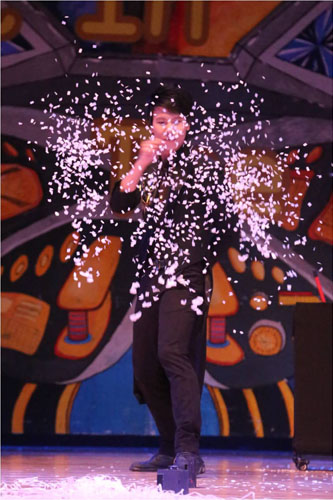 当观众还沉醉在黑白色调描绘的斑斓中时,另一场好戏正悄然上演。经贸员工钟文祥是长隆欢乐世界欢乐剧场驻场专业魔术师,耀眼的火焰、纷飞的纸片,一秒钟丝巾变彩旗的惊喜一一在他的《magic show》中神秘呈现。