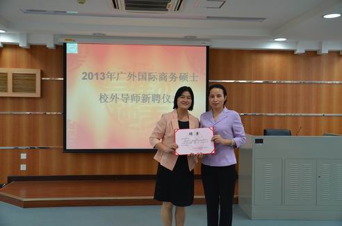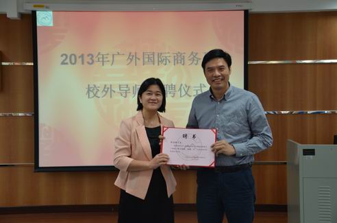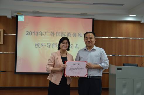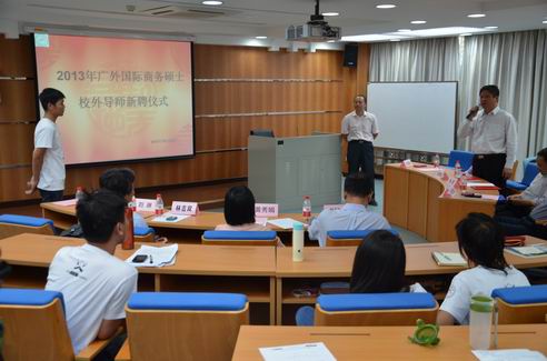 2013年10月25日下午,广外大国际商务硕士(MIB)校外导师新聘请仪式在云山校区九教举行。太阳城集团经理李铁立、书记黄秀娟、MIB教指委代表林吉双教授及全体2013级MIB研究生参加了聘任仪式。聘任仪式由MIB教育中心主任杨励教授主持。