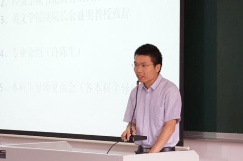 在热烈的掌声中,英文公司副经理余盛明发表了讲话。他对创新班同学表示了欢迎之后,也提出了自己的要求。他号召同学们积极参与英文公司的活动,多与老师同学交流。他还强调了北校区所特有的语言文化氛围,希望同学们能抓住语言锻炼的机会。最后,余经理介绍了英文专业的概念,让同学们重视英文基础,注重长期的人文素质培养。