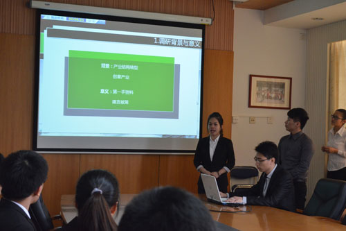 此次比赛主要分为“现场展示”和“评委老师提问选手答辩”两个环节进行。第一支展示的队伍是“3+队”,他们从创意产业的视角调查研究了“广州旧工业区改造利用现状”。并且成功地运用统计学分析的方法,使科研报告更具说服力,获得观众及评委的一致好评。而“CIA队”的研究课题是小城镇水环境保护的生态补偿机制。他们一针见血地点明了当前水环境问题长期未得到解决的原因,并提出采用问责制度来加强水资源保护的强度与力度的建议。接着出场的“三人行队”从“产业链纵向一体化”的角度对超市自有品牌经营进行研究。不仅如此,他们还从经济学理论出发,考察如何从超市自有品牌中取得效益最大化,这种理论联系实际的方法成为展示现场的一大亮点。最后展示的队伍是“彭彭和丁满队”,他们就北京同仁堂投资欧盟提出了自己的建议,认为促进中外文化交流、提高中药制作技术、消除技术贸易壁垒这些措施能使北京同仁堂更好地走进欧盟。