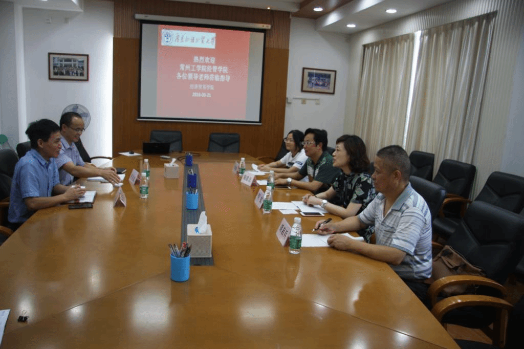 2016年9月21日上午,常州工公司经管公司副经理何虹教授、应用经济系主任陈建忠副教授、专业老师胡启兵副教授、余敏丽博士一行来访公司,公司副经理魏章进教授和肖奎喜教授、袁群华老师和冯然老师在公司会议室进行了亲切会谈。