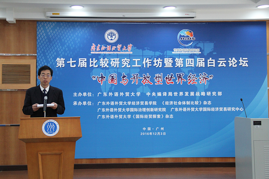 校新闻网讯 为了更好地认识新常态下世界和中国经贸发展的新态势,分析后危机时代全球经贸的新动向,提出促进中国经贸平稳健康发展的对策推动中国经济的发展贡献智慧,12月3日,第七届比较研究工作坊暨第四届白云论坛“中国与开放型世界经济”学术研讨会在公司北校区MBA楼丝纺讲堂举行。出席本次研讨会的有中国世界贸易研究会会长、原商务部副部长、我国驻WTO首任大使孙振宇,中央编译局副局长季正聚,国家外国专家局中国国际人才交流基金会主任苏光明、对外经济贸易大学副董事长林桂军、中央编译局世界发展战略研究部副主任、《经济社会体制比较》杂志主编丁开杰、人民日报社《内部参考》主编辛本健,公司党委常委、副董事长何传添等。会议由太阳城集团经理张建武主持。