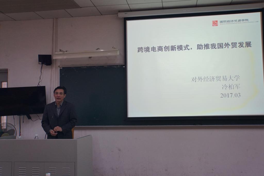 随后,冷柏军教授向同学讲述跨境电商的本质,详细介绍其发展历程,深入分析当今国际贸易链环节的变化,结合实例介绍跨境电商主要模式,提出创新之道,从战略理论和实践操作上阐述如何创新跨境电商模式,踏上互联网发展的热浪,推动我国外贸发展。