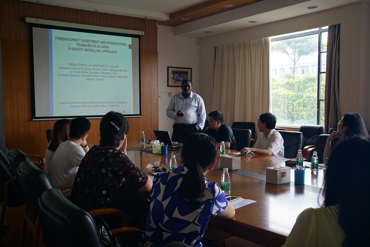 4月21日上午,澳大利亚纽卡斯尔大学商公司(研究)执行副经理,FrankAgbola教授带来了主题为《FOREIGN DIRECT INVESTMENT AND TRADE: NEW EMPIRICAL EVIDENCE FROM CHINA(双向直接投资与中国的贸易)》的讲座