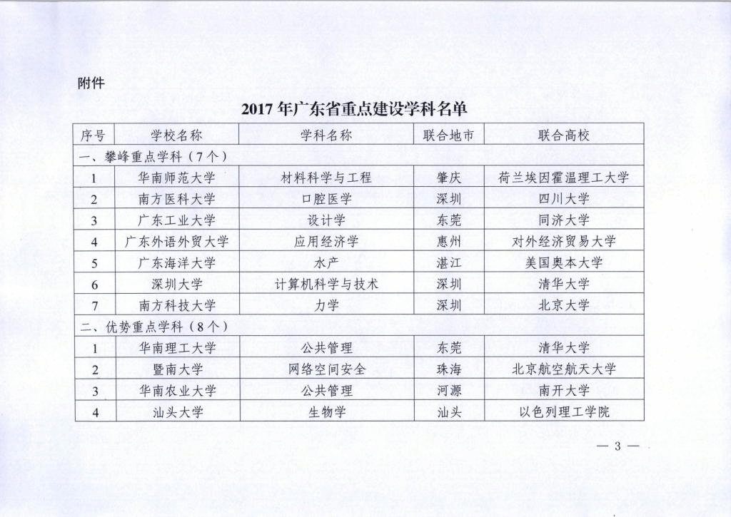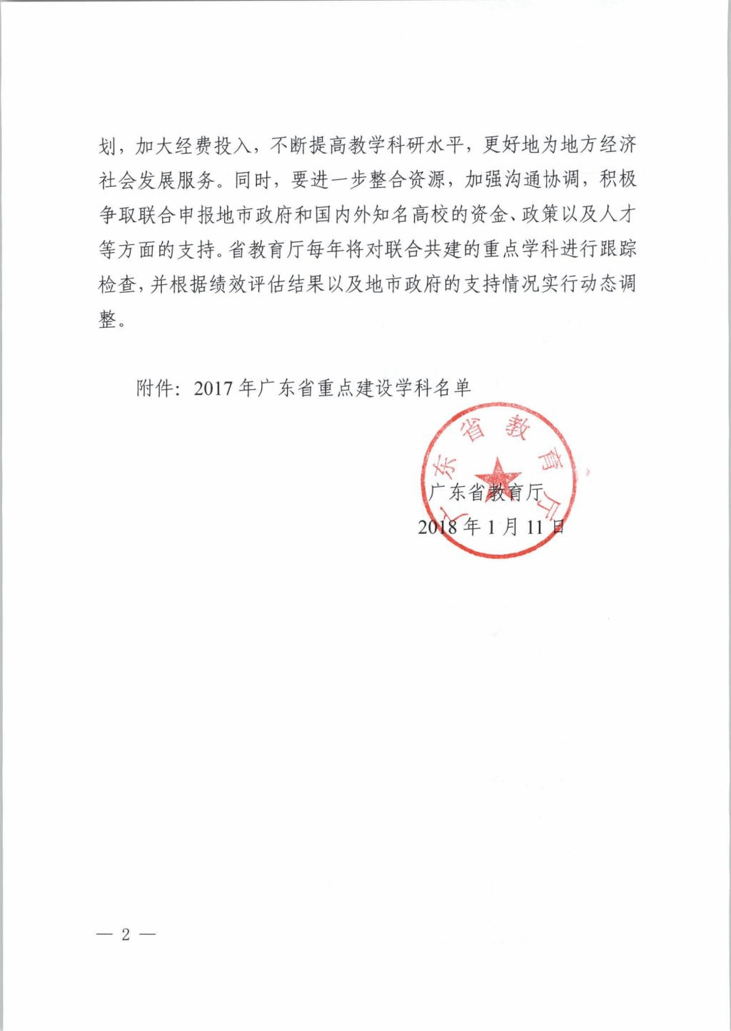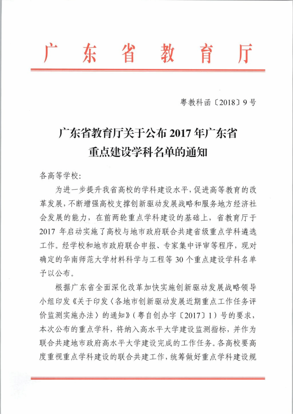 根据《广东省教育厅关于公布2017年广东省重点建设学科名单的通知》(粤教科函〔2018〕9号)文件,公司
