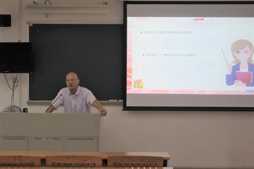 王俊以“读原文、悟原理、做个好党员好教师”为主题,指出开展主题教育的重要性,结合生动事例,讲述了认真贯彻“守初心、担使命,找差距、抓落实”的总要求,强调党员们要牢牢把握目标任务,落实重点措施,开展各个专项整治,加强对主题教育的领导。最后他阐述了思政课教师座谈会的五大强调,即青少年是祖国的未来、民族的希望;思政课是落实立德树人根本任务的关键课程;推动思政课改革创新,要不断增强思政课的思想性、理论性和亲和力、针对性;办好思政课关键在教师;办好中国的事情关键在党。