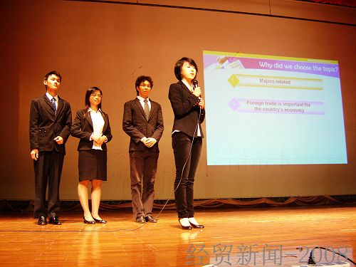 大部分小组都能以科学性、专业性强的幻灯片,整齐有序的团队分工,专业自信的姿态为我们展示了他们的出色的英语表达能力与逻辑严密的专业知识,各小组基本上以背景、现状、措施、结论的流程展示他们的课题。其中,第4组SEER以自信的笑容为我们展现了该组的专业姿态与超群能力。第9组“逆风之帆”刚出场时,台下拉拉队便高喊“我们一直在奋斗”的口号,震撼全场。比赛中间也穿插了歌唱表演及有奖竞答环节,活跃了全场的气氛。