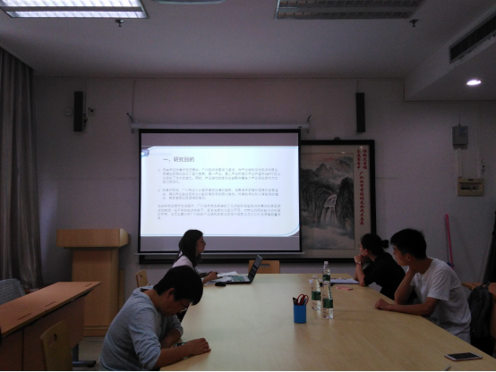 本次研究生学术论坛安排两组,一组为国贸组,一组经济组。每组同学根据自己的选题报对应的专业方向,然后与各位同学进行学术讨论。国贸组由两位同学进行汇报,2016级研究生周胜男,汇报的题目是《房地产引致经济波动的演化经济学分析》 ;2017级研究生张超颖,汇报内容为服务贸易自由化对粤港澳大湾区企业的影响。首先,张超颖同学根据自己的汇报内容分为选题背景、文献回顾、现有研究的不足与各位同学分享自己所看的文献综述以及自己的见解。之后是2016级周胜男同学向各位同学讨论自己的毕业论文进展情况,展示了房地产引致经济波动数据,并就论文的各部分进展与在座同学进行了热烈探讨。