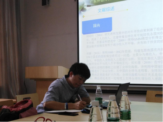 经济组同样由两位同学进行汇报,2016级研究生葛阳隆,汇报题目是《资本账户开放和收入不平等》葛阳隆同学从现实角度论述了选题的意义,并认真听取了安苑老师给予的指导意见,并就实证研究问题与安苑老师积极交流,与会师生就各种问题进行了良好互动。2017级研究生黎泳同学,汇报内容为改革开放40年广州产业结构变动与就业量研究,黎泳同学在讲解文献综述过程中就查阅文献遇到的难题虚心请教在场老师和师兄师姐。