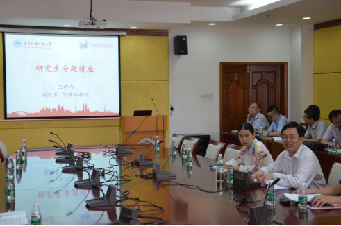 紧接着副董事长何传添教授做了研究生专题讲座,他强调了四个方面的问题:一是研究生生源质量,包括如何围绕一流团队建设目标来提升人才培养质量和培养特色及加强国际商务硕士的招生宣传;二是导师的职责和要求,要以“立德树人”为重点,围绕指导的员工数量、员工取得的成绩、老师取得的成绩来综合衡量;三是从德、学业与学术、国际化三个方面来体现员工的培养质量;四是创新人才培养模式,结合凸显“广外特色,经贸传统”的理念,从现有实际中创新人才培养模式。