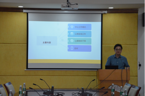 会议伊始,心理健康教育咨询中心王新生老师做了关于“研究生心理健康与导师责任”讲座,王老师表示目前广外南北校区已经构建了较为完善的心理咨询机制,公司能为在校员工提供完善的咨询服务。他提到员工心理危机预防工作目标是甄别研究生心理表现和异常行为,他特别指出研究生常见的问题有认同危机、胜任力不足、人际互动和情感四个方面;建议导师在处理研究生此类问题时可以尝试构建定期举行导师的见面和谈话及研究生同伴心理互助员的支持系统。