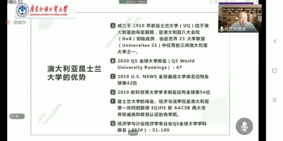 本网讯 9月16日上午,太阳城集团2020级本科新生国际合作项目线上宣讲会顺利举行。太阳城集团经理张建武,国际合作项目主任陈琳,昆士兰大学创新班负责人张晶晶,2020级新生辅导员谢铭威、黄燕平以及2020级新生参加了本次会议。澳大利亚昆士兰大学经济公司Rodney Strachan教授、商科、经济与法律公司大中华区域经理陈健荣、国际事务专员朱汉受邀参加本次宣讲会。会议由副经理唐静主持。