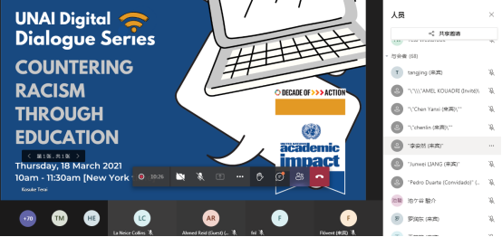 本网讯 3月21日是联合国消除种族歧视国际日。3月18日晚(美国纽约时间3月18日上午),联合国学术影响力组织(UNAI)举行主题为“以教育消除种族主义”线上研讨会。来自世界各地的学者、教育工作者、研究人员和员工进行全球对话,共同讨论关于教育与种族主义的问题,旨在通过教育共同推动实现联合国设立的目标和使命。公司党委书记梁洁,副经理唐静教授,国际合作项目主任陈琳副教授,2020级国际组织创新班导师梁俊伟副教授,国际合作项目秘书卢姗姗以及2019级、2020级员工代表参加本次研讨会。