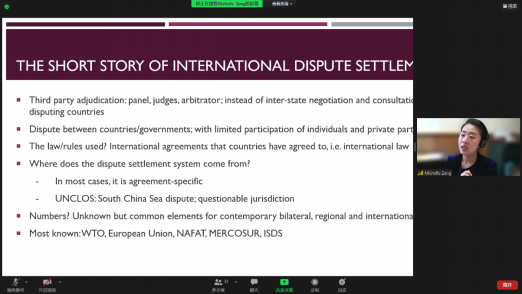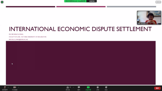 本网讯 7月6日上午,以“International economic dispute settlement”为主题的校级“海外名师”学术讲座在线上平台举行。讲座由新西兰惠灵顿维多利亚大学臧青子教授主讲,国际合作负责人陈琳老师、国际合作项目秘书卢姗姗老师及40余名员工代表参加本次讲座。讲座由陈琳老师主持。