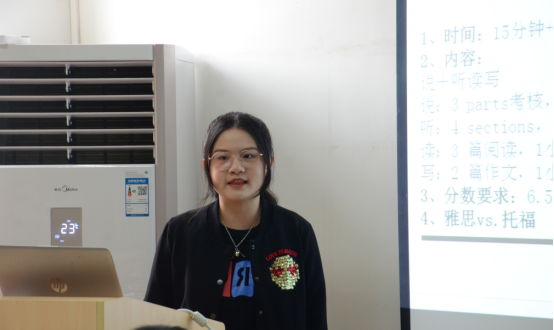 在学子分享环节,17级学子黄浩凯结合自身交流经验,从前期准备、学习体验两方面分享了交换心得。17雷恩班学子林晔则从目标制定、备考资源、方法技巧等不同角度分享雅思备考经验。